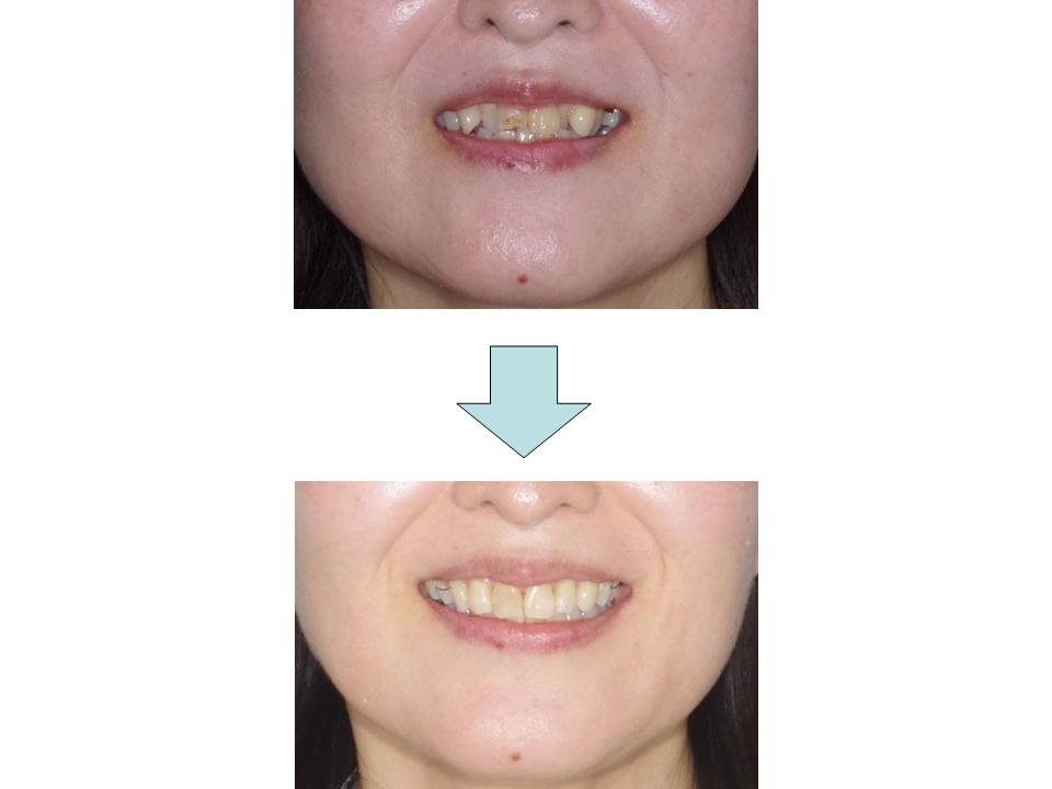 すでに傷んでいる歯が多く、それらを抜歯して状態の良い歯を残して治療を行いました。歯ならびの改善するのに望ましくない場所の抜歯を補うために歯科矯正用アンカースクリューを用いて治療を行い、効率的な移動の結果比較的短期間で良好なかみ合わせにすることができました。