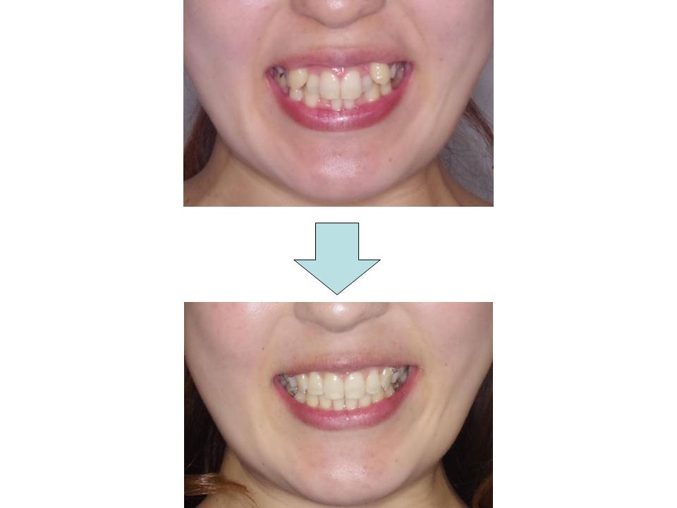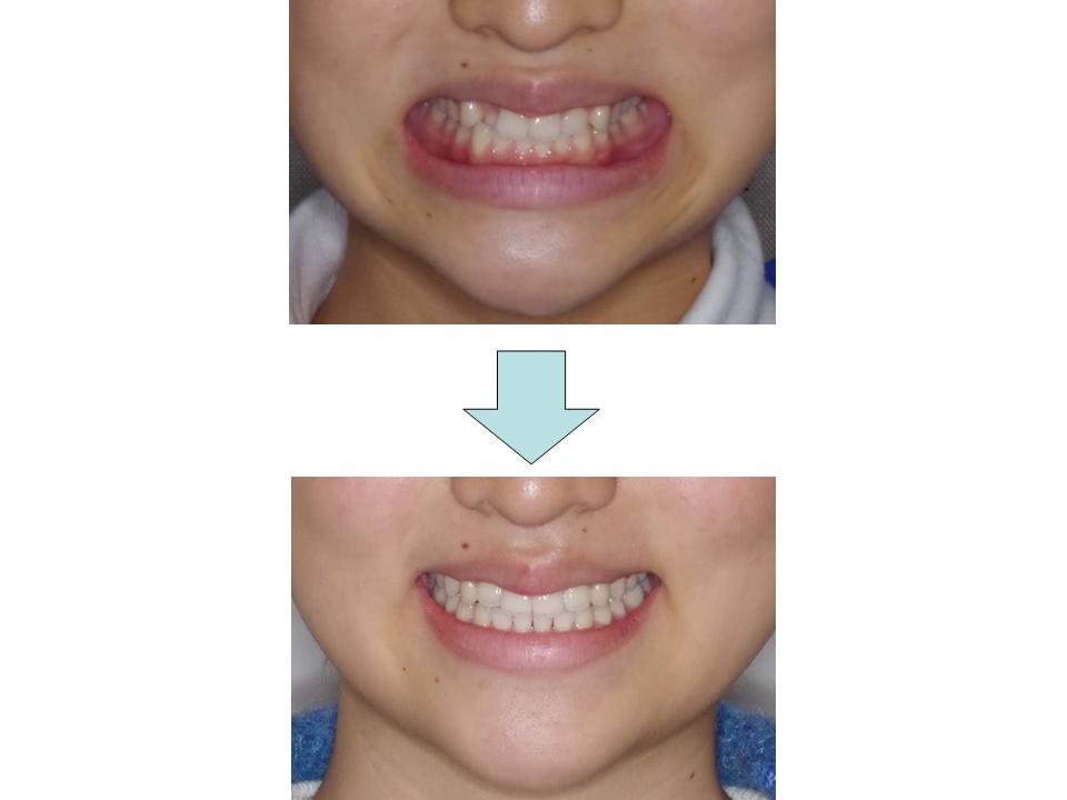 あごと歯の大きさのバランスの乱れと上下のかみ合わせのずれの是正のため上下の歯の抜歯を行いました。適切な装置使用の結果、良好なかみ合わせにすることができました。