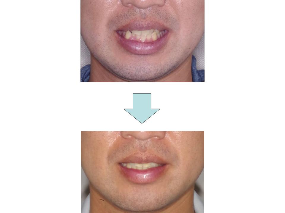 すきっ歯の原因が下の前歯が強く当たっていることと考えられ、下の前歯のかみ合わせを浅くして上の歯との当たりを弱くすることを図りました。下唇などの力が強く、その分期間がかかりましたが最終的に良好なかみ合わせとすることができました。