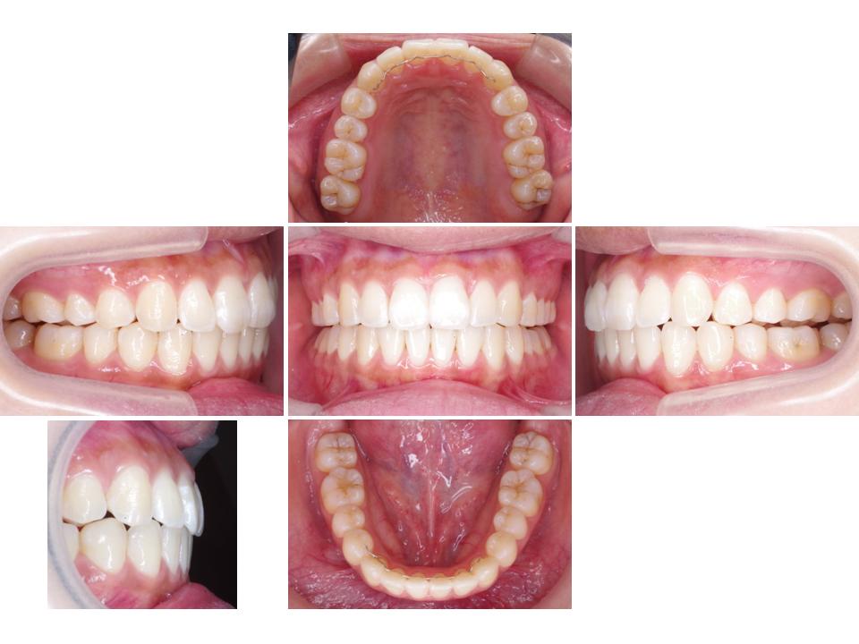 凸凹の原因が歯の大きさが大きいことであり口元や歯の角度も正常であったため、わずかに歯を小さく削り歯ならびを整えました。装置の使用状況も適切であり、比較的短期間で良好なかみ合わせにすることができました。