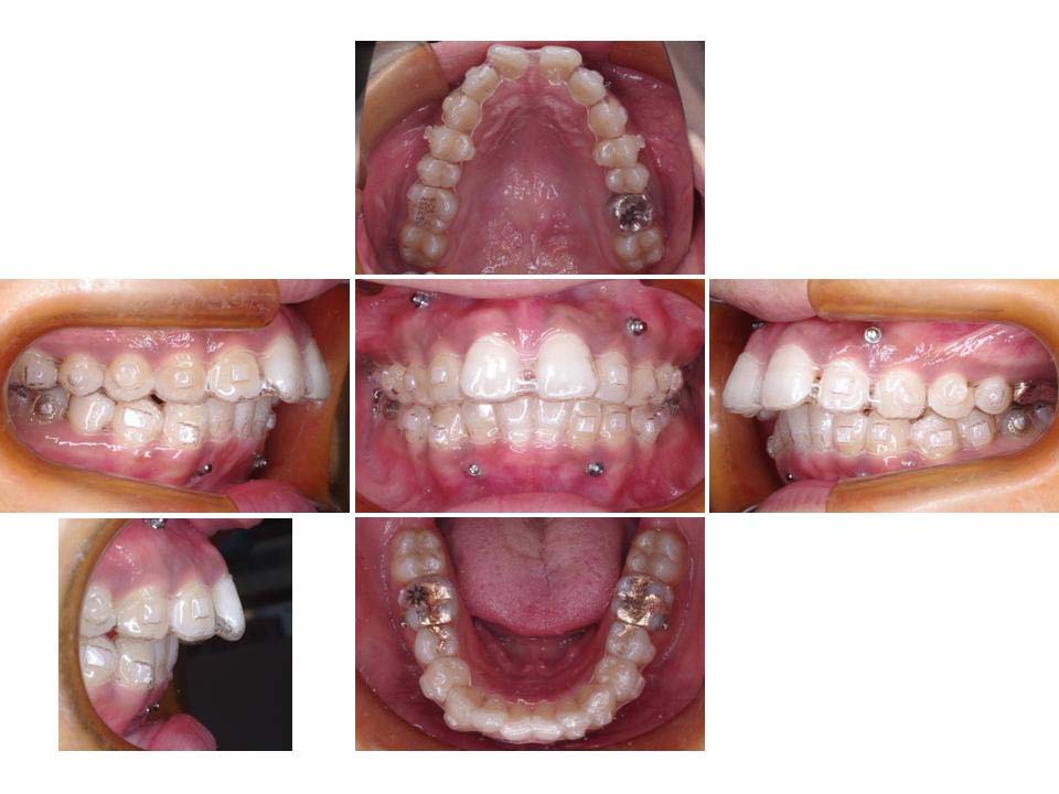 かみ合わせの改善のために上下の歯の抜歯を行いましたが、左上の歯で予後が悪い歯があったためにトランスパラタルアーチと歯科矯正用アンカースクリューを併用してかみ合わせの改善を行いました。装置を適切に使用した結果、良好なかみ合わせにすることができました。