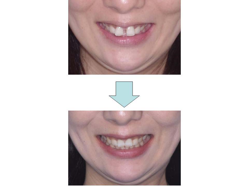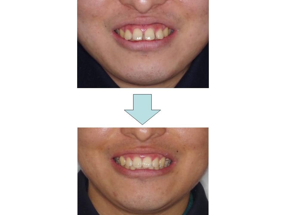 唇の裏の筋が長いことがすきっ歯の原因と考えられるため、筋を短くする処置を行ったの後に治療を開始しました。しっかりと装置を装着して治療を行うことができ、良好なかみ合わせにすることができました。